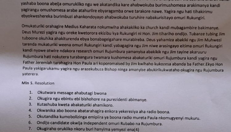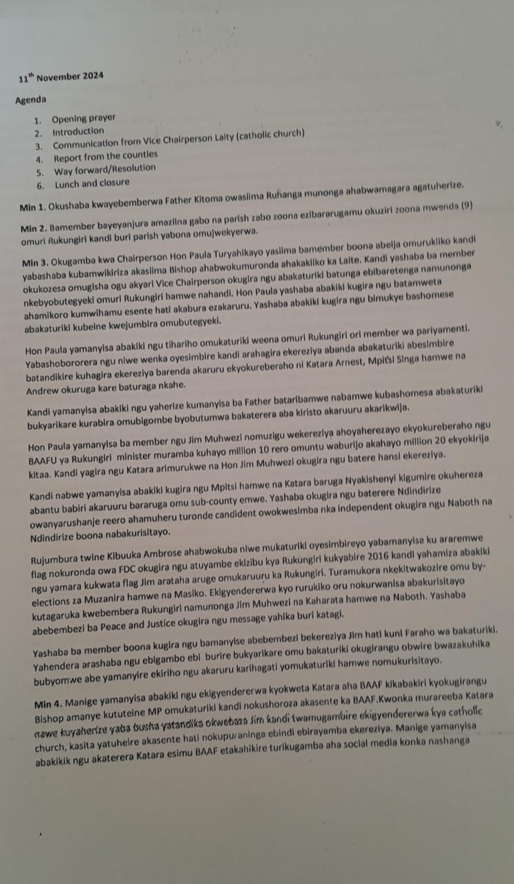 As you will see in the attached copy of the minutes of a meeting she convened on November 11, 2024, as the Chairperson of Peace and Justice in Rukungiri, Mary Paula, in her opening remarks, lamented about the absence of a Catholic Member of Parliament in the entire Rukungiri District.