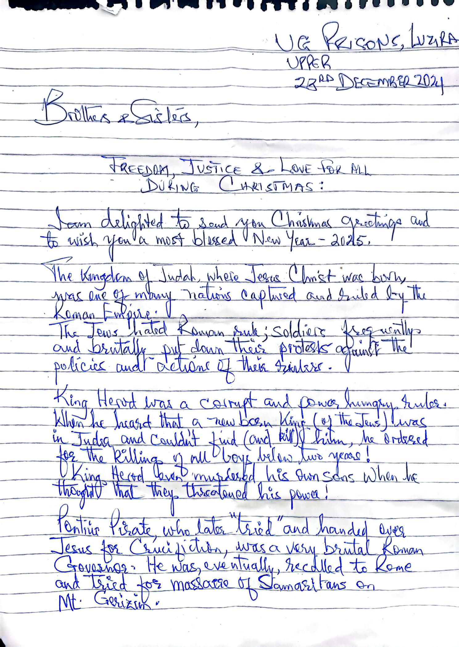 Dr. Kizza Besigye, a four-time Ugandan presidential candidate and prominent opposition leader has written a heartfelt letter from Luzira Upper Prison addressing his supporters and the public as the Christmas season approaches.