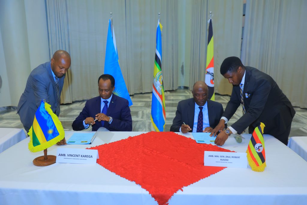- THE UGANDA DELEGATION WAS LED BY MAJ. GEN. (RTD).ROBERT RUSOKE, HIGH COMMISSIONER OF THE REPUBLIC OF UGANDA TO RWANDA, WHILE THE RWANDA DELEGATION WAS LED BY AMBASSADOR VINCENT KAREGA, AMBASSADOR AT LARGE AND RWANDA’S ENVOY TO THE GREAT LAKES REGION.