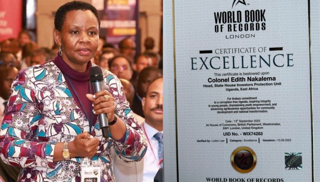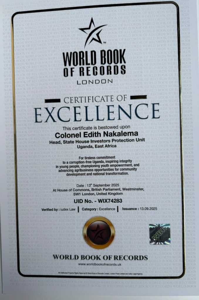 The Head of the State House Investors Protection Unit (SHIPU), Col. Edith Nakalema has been honoured with the World Book of Records Certificate of Excellence at the House of Commons, British Parliament, in London on September 13 2025.