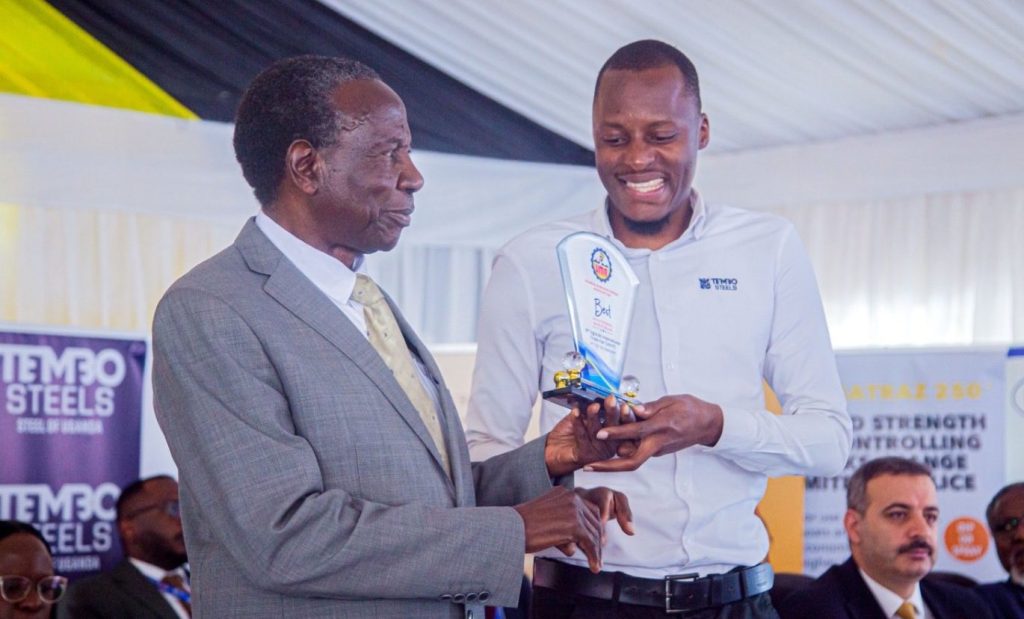 Matia Kasaija, Minister of Finance, Planning and Economic Development, presented the award to Tembo Steel’s Senior Marketing Executive, Wycliff Nyesiga.