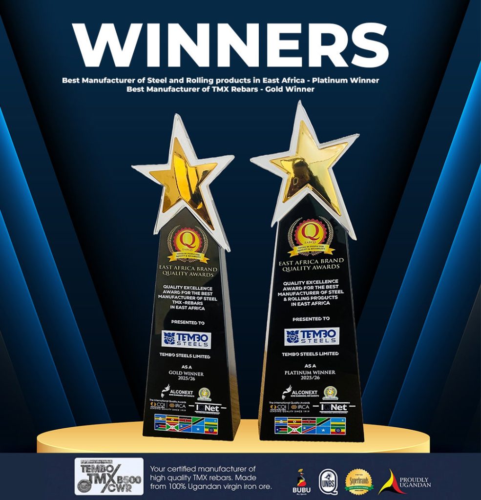 Tembo Steels (U) LTD has once again been named East Africa’s Best Manufacturer of Steel & Rolling Products (Platinum) and Best Manufacturer of TMX Rebars ( Gold) at the 2025 East Africa Brand Quality Awards