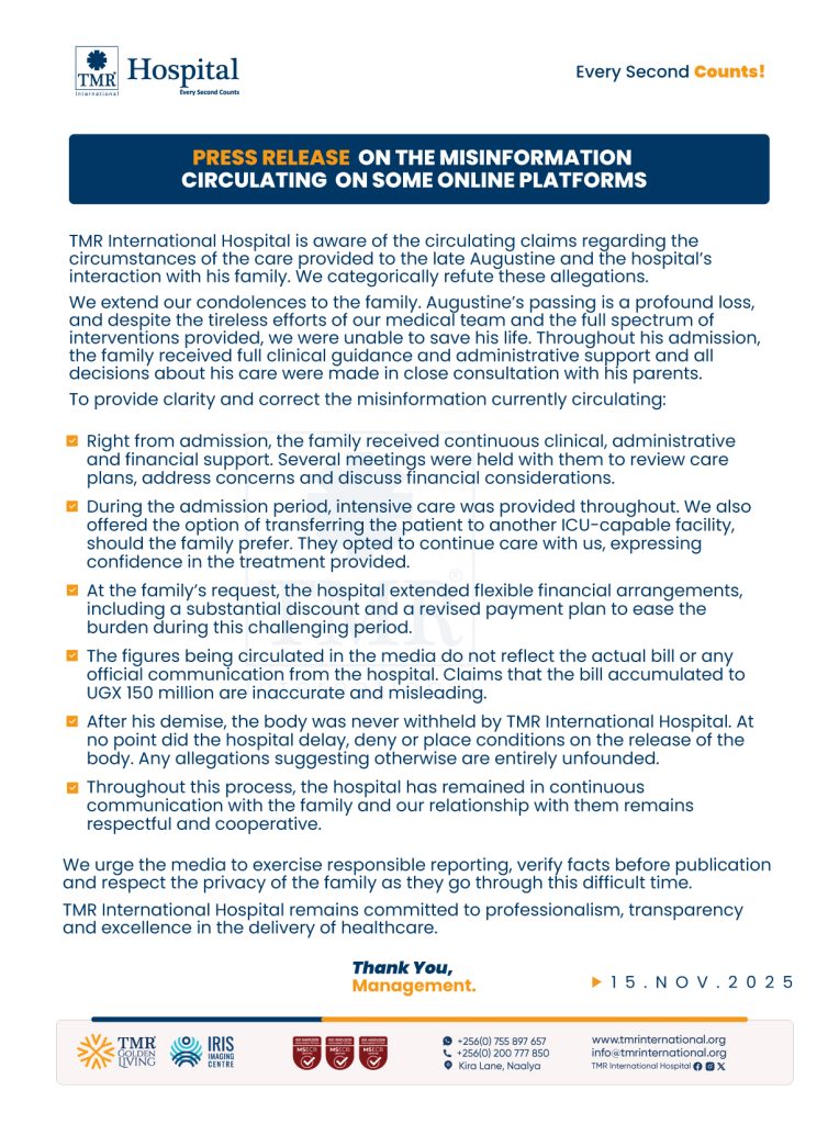 TMR International Hospital has trashed the circulating claims regarding the circumstances of the care provided to the late Augustine and the hospital’s interaction with his family.