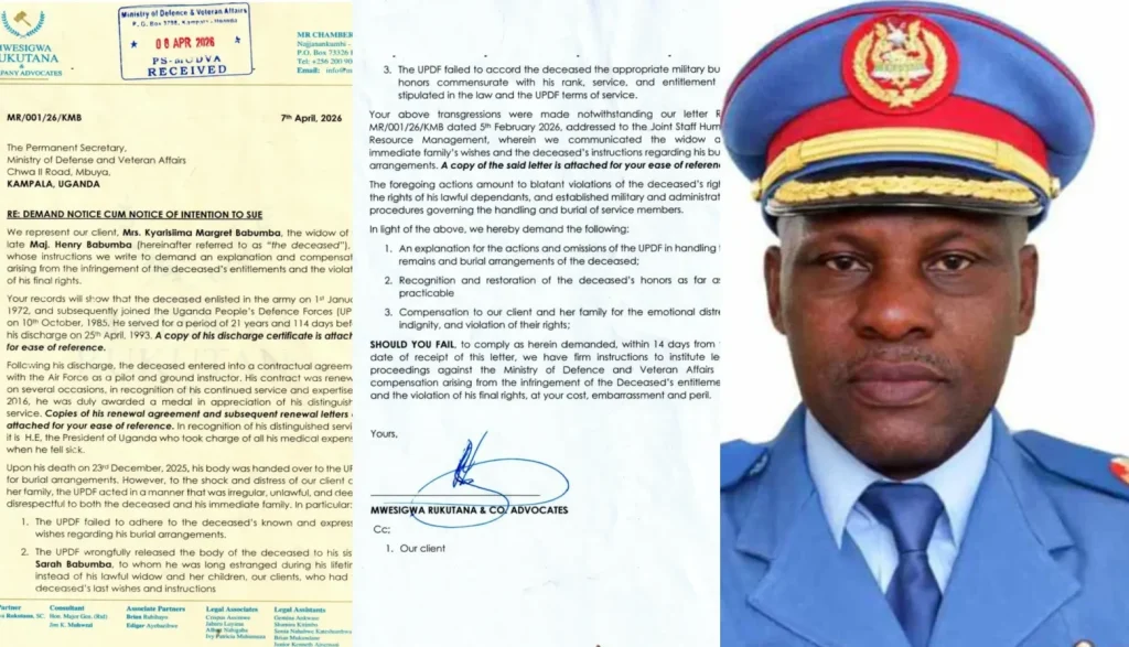 Maj. Babumba, who died on 23rd December 2025, had been entrusted to the UPDF for burial arrangements. However, a legal notice issued through Mwesigwa Rukutana & Co. Advocates alleges that the army mishandled the remains in a manner described as “irregular, unlawful, and deeply disrespectful.”