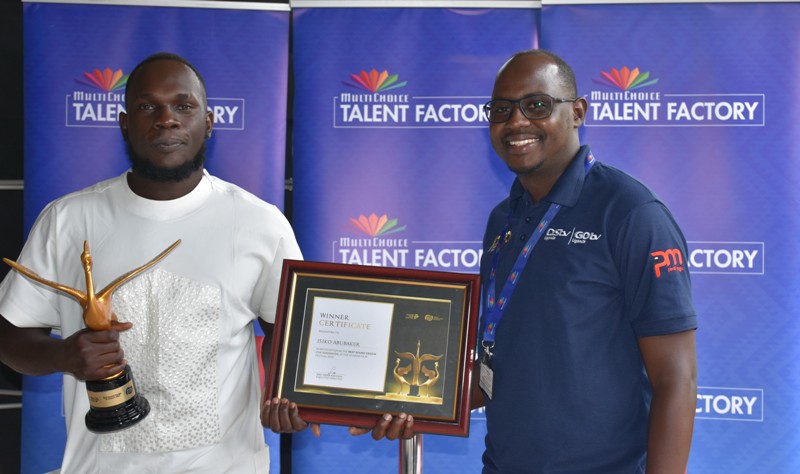 Abubaler Isiko, a MultiChoice Talent Factory Alumni together with Rinaldi Jamugisa, PR and Communications Manager during the official announcement at the MultiChoice Uganda Head Offices in Kololo.